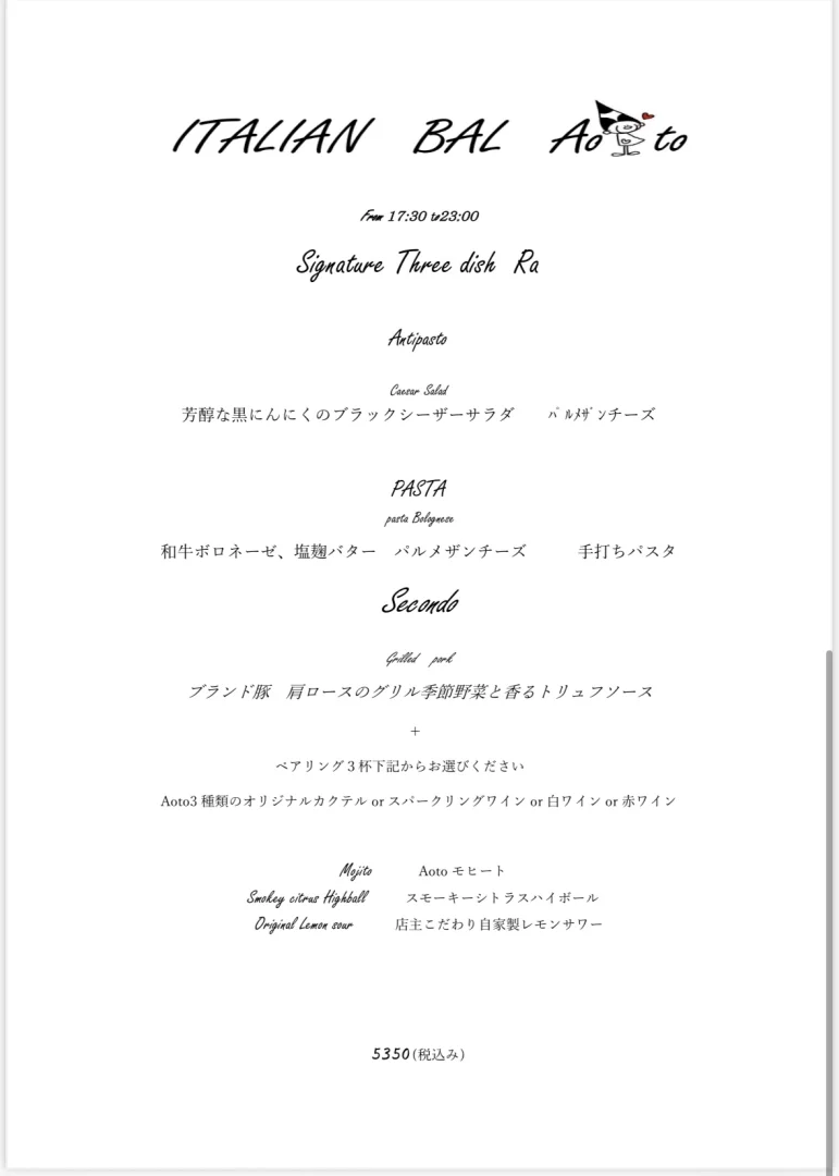 さらに、パスタ・肉料理・サラダを堪能できるAotoランチコース(3,400円/税込)もご用意。